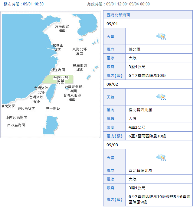 中央氣象局海象預報,今天台灣北部海面是大浪,浪高3至4公尺,風力6至7雷雨區陣風10級。明天仍是大浪,浪高4轉3公尺,風力6至7雷雨區陣風10級。後天(3日)風浪才會轉小為5至6雷雨區陣風9級。