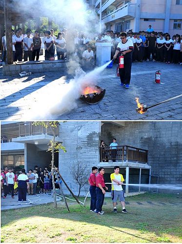 隨後是實務操作,一、二年級學生分成兩組帶開,由各組消防人員親自操作示範各項滅火器具及消防栓操作方式,如滅火器操作時記住三要訣「拉拉壓」(拉插銷、拉鼻管、按壓柄);消防栓操作時記住五口訣「按開拿拉轉」(按下手動報警器、打開消防栓箱門、拿瞄子、拉水帶、轉開制水閥、噴水救災),許多同學都在尖叫聲中完成「水與火」雙考驗,印象深刻。