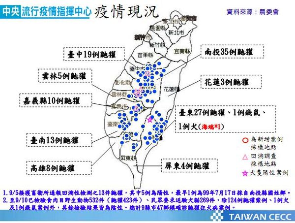 問題2.( )目前台灣只有鼬獾和錢鼠驗出狂犬病, 流浪犬貓還沒有任何驗出狂犬病?請大家參考9月10日最新疫情做答喔!