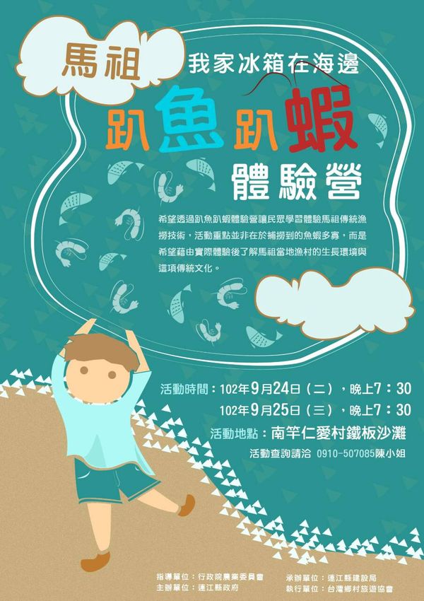 而此次將舉辦系列活動中之一的「趴魚趴蝦體驗營」,目的是希望透過這項活動讓民眾學習馬祖傳統漁撈技術,體驗活動重點並非在於捕撈到的魚蝦多寡,而是希望經由實際體驗後,了解馬祖當地漁村的生長環境與這項傳統文化,並讓大家知道當在品嘗這些鮮美的魚貝料理的同時,都是漁夫們辛苦捕撈上來才有的。
