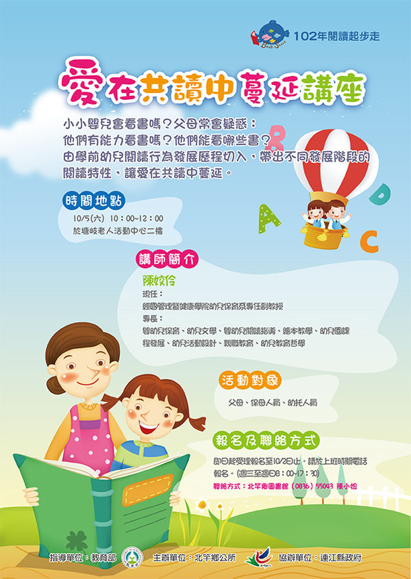 北竿閱讀起步走-10/5愛在共讀中蔓延講座 --閱讀人次 : 747 小嬰兒會看書嗎?父母常會疑惑:他們有能力看書嗎?他們能看哪些書?