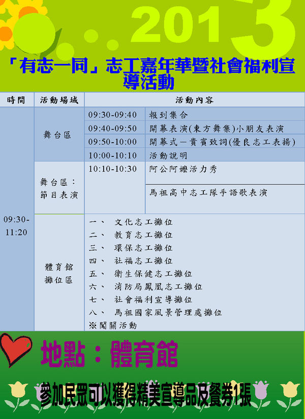 11/24「志工一同」志工嘉年華,歡迎來逗陣 --閱讀人次 : 1143 1.透過志工嘉年華活動以結合本縣各志工團隊之志願服務人員,除增進各團隊間彼此的了解認識及相互經驗分享,並擴大各團體間的服務思維、啟發思考,以強化培養服務他人、互助合作精神,進而打造連江縣更優質的生活,營造美麗海上桃花源