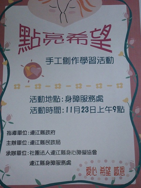 點亮希望-手工創作學習活動~ --閱讀人次 : 1020 社團法人連江縣身心障礙協會於(11月23日)週六上午九時,舉辦「點亮希望」手工創作學習活動,活動地點:連江縣身心障礙協會旁(身障服務處)歡迎地區障友及家屬志工踴躍參加,敬請提早報名,欲報名或有活動相關疑問請來電洽詢,電話:25963傳真25362王小姐。