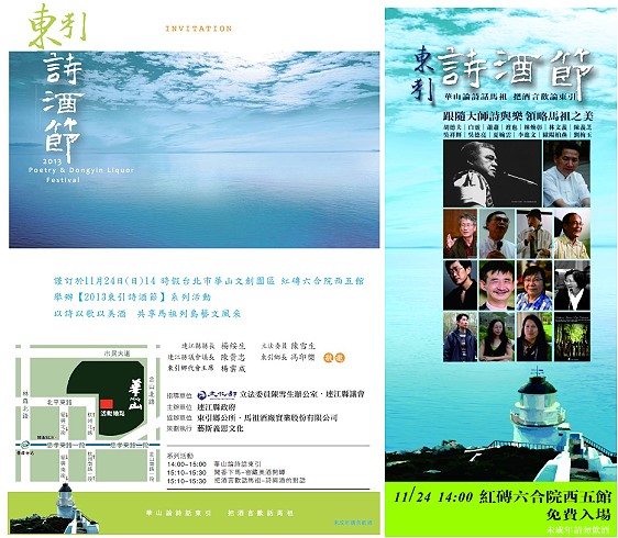 「東引詩酒節」24日在華山藝文特區的活動將邀請名作家林文義、吳祥輝對談「華山論詩話馬祖—馬祖印象」,連江縣長楊綏生將主持窖藏美酒開罈典禮、並參與詩與酒的對話等活動,現場並邀請胡德夫、白靈、夏婉雲、林文義、林煥彰、渡也、陳義芝、吳德亮、李進文、歐陽柏燕、翁翁等知名詩人及南臺灣交響樂團齊聚華山藝文特區,另外馬祖在地詩人劉梅玉亦參與此一盛會,透由音樂與詩並結合白酒,將東引「詩」與「酒」的獨特魅力呈現在國人面前。