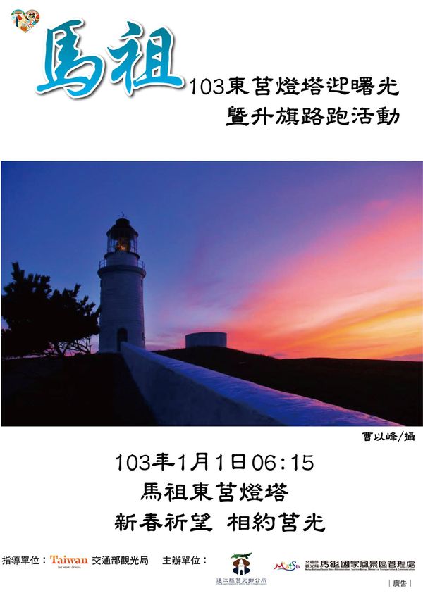繼前年、去年的元旦迎曙光活動在東引燈塔和北竿壁山舉辦後,馬管處今年選在東莒燈塔,同時舉行升旗和路跑活動,時間是早晨6點15分。馬管處首先在臉書中貼出海報照片,海報中的照片是曹以鋒攝影,後續的相關報導,請大家留意馬管處的公告。