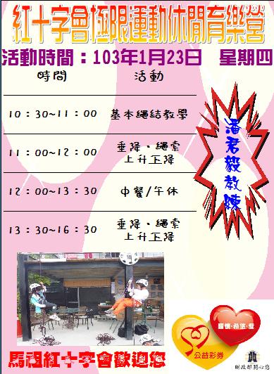 紅十字會極限運動休閒育樂營 --閱讀人次 : 996 本次活動因天氣關係原本訂於19日改為23日