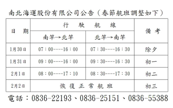 南北海運春節航班異動