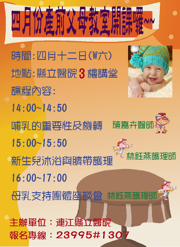 縣立醫院產前父母教室開課囉~~ --閱讀人次 : 729 連江縣立醫院產前父母教室開課囉!! 歡迎準父母一起來參加∼