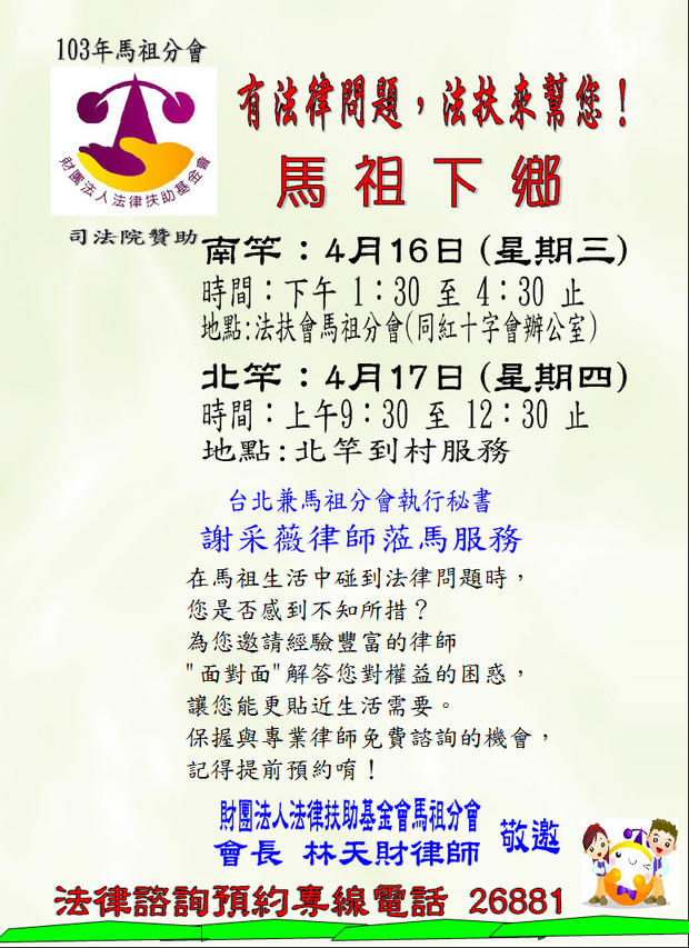 律師下鄉法諮預約--南竿4/16 北竿4/17