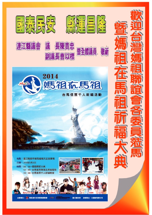 台灣媽祖聯誼會年度會員大會,在連江縣政府及馬祖境天后宮大力爭取下,今年首次移師馬祖舉行,縣府、馬祖國家風景區管理處及馬祖境天后宮等單位共同籌劃「2014媽祖在馬祖台馬信眾千人祈福活動」,台灣各地媽祖宮廟及地區四鄉五島廟宇將齊聚一堂,這次是在馬祖地區擴大舉辦的媽祖信仰盛會,亦是國內媽祖信仰界的一大盛事。