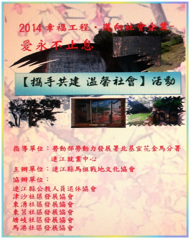 7月5日「邁向社會企業-愛永不止息」活動 --閱讀人次 : 798 勞動部「2014幸福工程•邁向社會企業-愛永不止息計畫」訂於103年7月5日上午09:00假南竿鄉上腰山營區舉辦「攜手共建 溫馨社會」活動。歡迎地區軍民蒞臨指導,共襄盛舉。