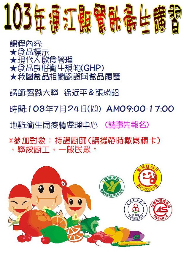 103年餐飲衛生講習 --閱讀人次 : 958 本局於07/24(四)辦理餐飲衛生講習-南竿場,邀請實踐大學教授-徐近平老師及張瑛玿老師授課,本次授課內容: