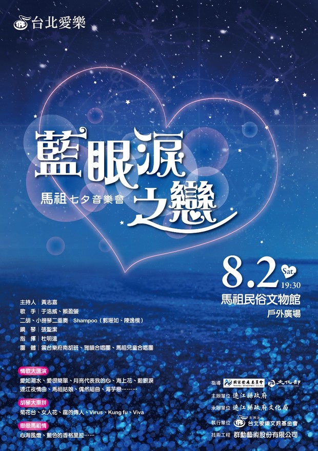 邀請入選「中國好聲音」的賴盈螢、「小張雨生」于浩威、「大學生了沒」固定班底黃志嘉Juicy以及中西合璧─二胡、小提琴女子團體「Shampoo」(郭珊如、陳逸樸)輪番上陣,另外,還有雲台樂府南胡班、雅韻合唱團、馬祖兒童合唱團等數十位表演者,要和馬祖的朋友們一起度過這個浪漫七夕。