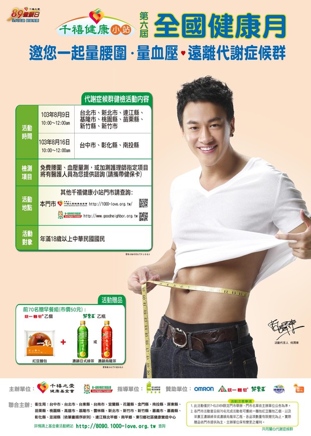 衛生局配合千禧之愛健康基金會辦理『血壓及腰圍量測活動』,推廣「腰圍八九十,健康常保持」的代謝症候群防治觀念,歡迎各位鄉親踴躍參加。