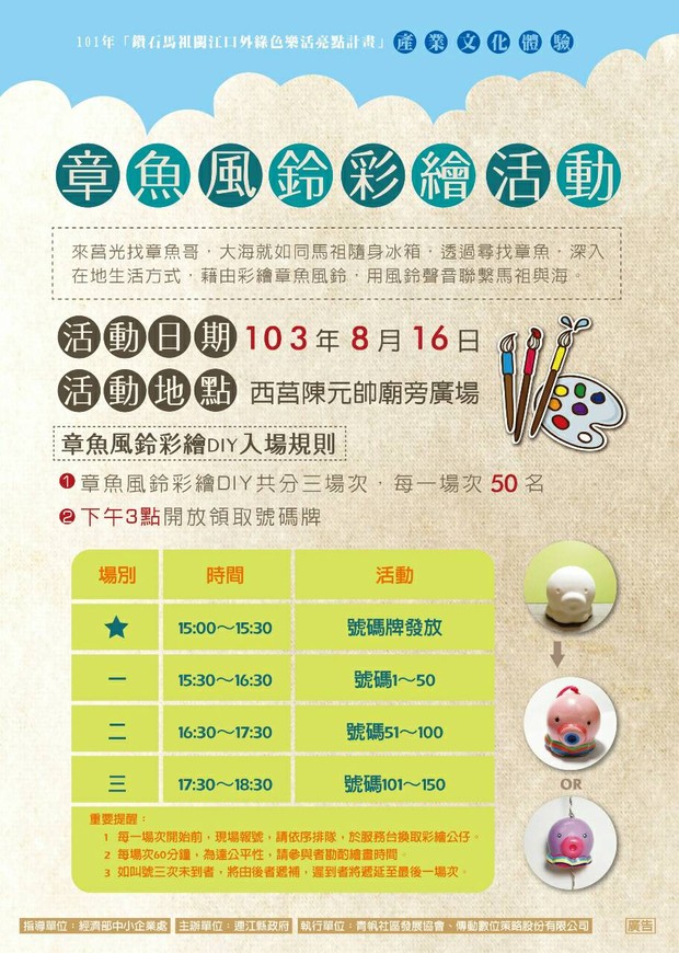 1.章魚風鈴彩繪DIY共分三場次,每一場次50名