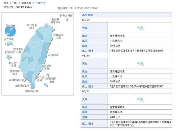 中央氣象局8月20日馬祖近海海象預報