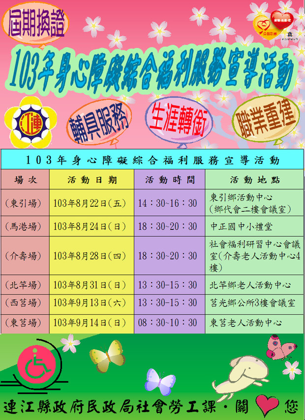為協助明(104)年屆期需換證民眾及原持有永久效期手冊者,瞭解換發ICF新制證明相關注意事項,及宣導身心障礙經濟補助、生涯轉銜、輔具服務、職業重建等相關福利資訊,並培力身心障礙朋友與家屬,連結適切之服務,特規劃於103年8月22日至9月14日,前往本縣四鄉五島辦理身心障礙綜合福利宣導影片說明會,如有相關疑問,可來電詢問(0836)25022分機306李先生,敬請把握機會,全程參與者可獲得精美宣導品一份。