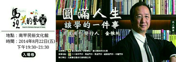 【本報訊】圓滿人生,該學的一件事。商業周刊創辦人-金惟純先生邀請您22日晚間7時30分到南竿民俗文物館一起學習圓滿人生。