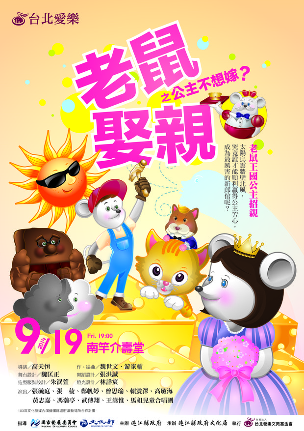 縣府文化局主辦「老鼠娶親之公主不想嫁?」兒童劇將於9月19日晚間7點在南竿介壽堂舉行,由愛樂劇工廠及馬祖兒童合唱團等數10位表演者擔綱演出,老鼠王國公主招親,究竟誰能順利贏得公主芳心,成為最厲害的新郎倌呢?歡迎闔家大小一同前來會場欣賞精彩演出。