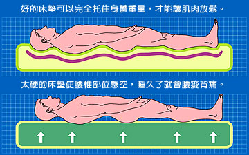 根據研究,硬床可以減輕背痛,所以老年人選擇較硬的床,主要原因是床太軟,臀部因重量相對身體其他部位較重,一睡就陷下去,反而引起腰椎過度向前突出,容易導致半夜痛醒或早上睡醒後更不舒服。床墊過軟或過硬,都會造成身體局部或軀幹的肌肉緊繃不適,以至於隔天醒來愈睡愈累。 太硬的床身體躺上去,腰椎部位有空隙,表示腰部懸空,睡久了就會腰痠背痛,所以選擇一張正確的好床是極為重要的。