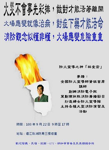 連江縣消防局為提升各旅宿業者及民眾防火教育,特聘請台灣消防宣導之神林金宏赴馬授課,請有意願的民眾103年9月22日早上9時至下午17時,於消防局三樓禮堂上課!