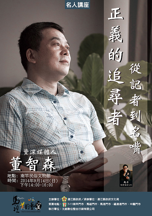 【記者劉爵誠�南竿報導】正義的追尋者-從記者到名嘴,縣府文化局名人講座邀請到資深媒體人董智森14日下午2時至4時於南竿民俗文物館舉行,邀請您一起發現不為人知的社會秘辛。