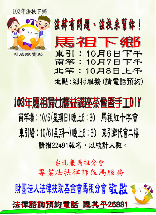 10/5-8法扶馬祖下鄉法律諮詢服務 --閱讀人次 : 748 10/5-8 馬祖下鄉服務律師簡介