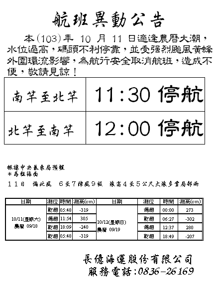 南竿至北竿10:30,北竿至南竿11:00停航,不便之