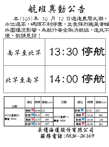 10月12日南北竿航班異動【金龍輪】