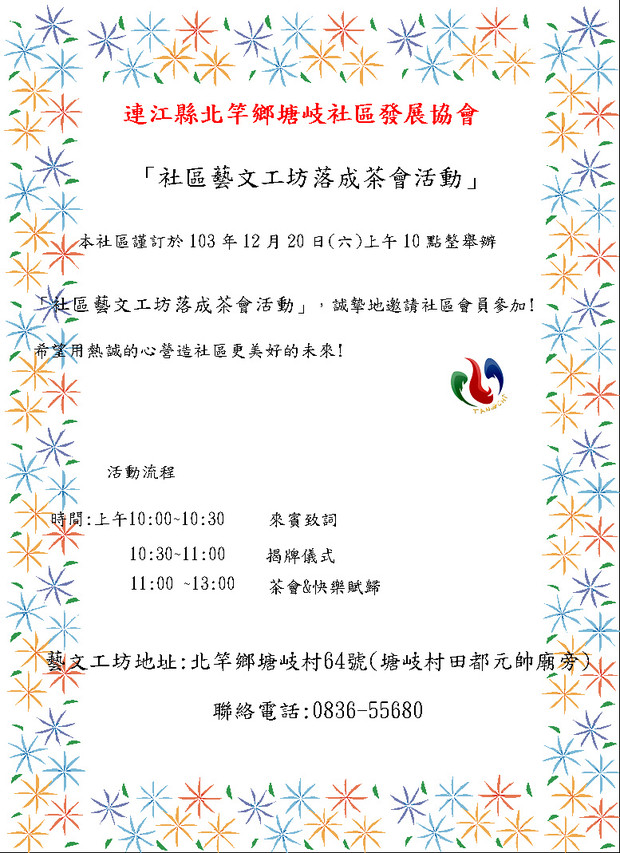 「社區藝文工作坊落成茶會」敬邀各位嘉賓及社區會員參加!!