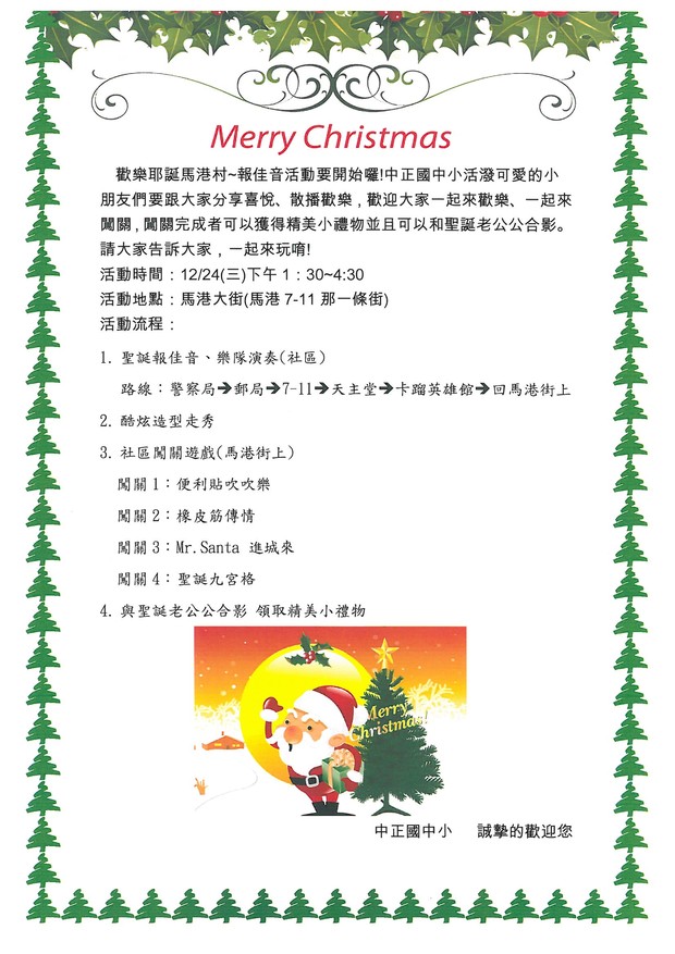 歡樂耶誕馬港村~報佳音活動要開始囉!中正國中小活潑可愛的小朋友們要跟大家分享喜悅、散播歡樂,歡迎大家一起來歡樂、一起來闖關,闖關完成者可以獲得精美小禮物並且可以和聖誕老公公合影。請大家告訴大家,一起來玩唷!
