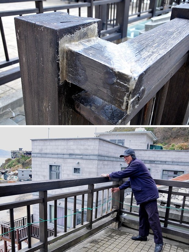橋仔漁展館屋頂觀景台是遊客必到之處,平時村民也喜歡在觀景台休閒,但平台上的木製欄杆年久失修,結構鬆散搖搖晃晃,安全堪虞。村民表示,漁展館還有漏水問題也要改善,部分欄杆暫時用玻璃纖維修補,希望政府有關單位能協助改善。