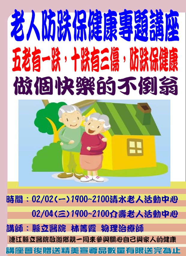 連江縣立醫院於2月4日19:00∼21:00,於介壽村辦理老人防跌宣導,由林菁霞 物理治療師主講「老人防跌保健康」講座,歡迎民眾踴躍參加。