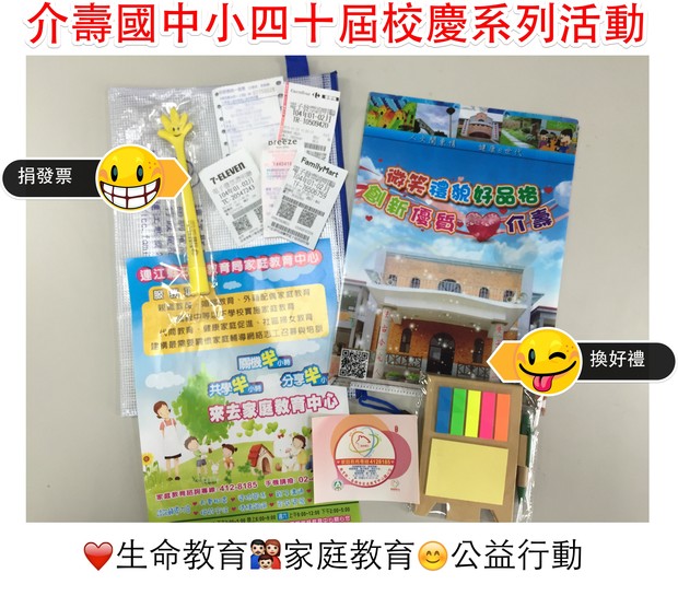 連江縣立介壽國中小暨幼兒園四十屆校慶即將於104.3.29(日)登場,系列活動已經展開,開學第一個活動為《愛心捐發票公益行動》,結合本縣教育局家庭教育中心致贈國中小學生禮品與學校製作精美的LU文件資料夾,推出愛心發票換好禮公益活動,希望各位家長、學生踴躍參與這有意義的活動!