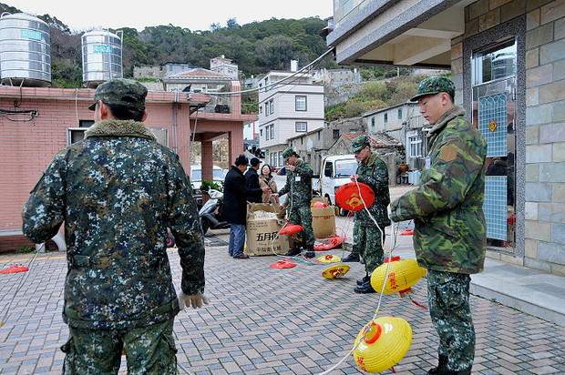 2015北竿元宵擺暝文化祭活動行程已經排定,今年更首度結合兩馬鬧元宵讓兩岸共慶元宵佳節,北竿地區元宵節活動熱鬧精彩可期。為了迎接一年一度的元宵盛會,北竿各村境廟宇近日展開燈籠佈置工作,到處張燈結綵一片「喜氣羊羊」 ,這項吃力工作光靠社區民眾無法獨自完成,經公所協調請軍方支援協助,參與的弟兄們也十分熱心,對於服役期間能參與北竿年度盛事也表示高興,元宵期間也要和島上居民共度佳節。