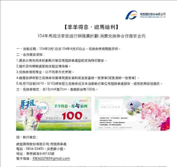 3.旅行行者必需落實將兌換券於旅客抵達馬祖第一天發放,也不得以兌換券折抵團費,若經查證無實際將兌換券發放給遊客,承辦單位有權終止配合之關係。