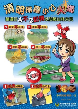 焚香祭祖多注意,山林田野免受害! --閱讀人次 : 524 各位鄉親大家好:傳統習俗清明掃墓季節又即將到來,為避免因為燒冥紙或燃放鞭炮造成的山林火災,東引消防分隊呼籲民眾祭祖掃墓,請注意「四不二記得」的口訣,避免火災發生。