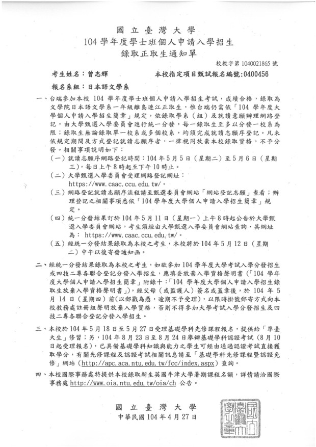 狂賀~北竿鄉公所曾德祥公子曾志輝錄取國立台灣大學日本語文系正取