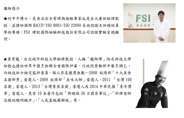 5/17(日)辦理104年餐飲衛生講習 --閱讀人次 : 697 時序即將接近夏季氣溫逐漸上升也是旅遊旺季,為避免食物中毒發生保障旅客食的安全,原訂4月20日(一)因天候因素改期為5月17日(日)辦理餐飲業者衛生講習,特邀請國際HACCP聯盟登錄認可主任訓練師何中平博士及台北城市科技大學黃景龍(龍師傅)助理教授擔任講師,講習時間地點: 5月17日上午8時至下午17時40分於衛生局疫情理中心。本次邀請餐飲衛生講習講師可說是學有專精,不管是學界、業界均經驗豐富,能在百忙之中前來希望地區餐飲廚師們及有興趣的民眾能前來汲取經驗提升餐飲衛生水平與新知,本局提醒參加者請先來電報名,報名電話:0836-22095*8841,並請攜帶廚師繼續教育時數累計卡以便登錄作業 (要申請時數累積卡需帶1張1吋大頭照) 。