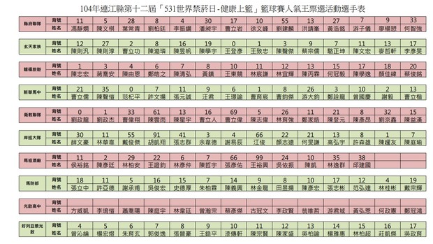 104年連江縣第十二屆「531世界禁菸日-健康上籃」籃球賽人氣王票選活動選手表
