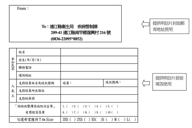 11、 明信片投遞地址:209-41連江縣南竿鄉復興村216號,疾病管制課收。如有相關問題,煩請電洽(0836)22095轉8852。