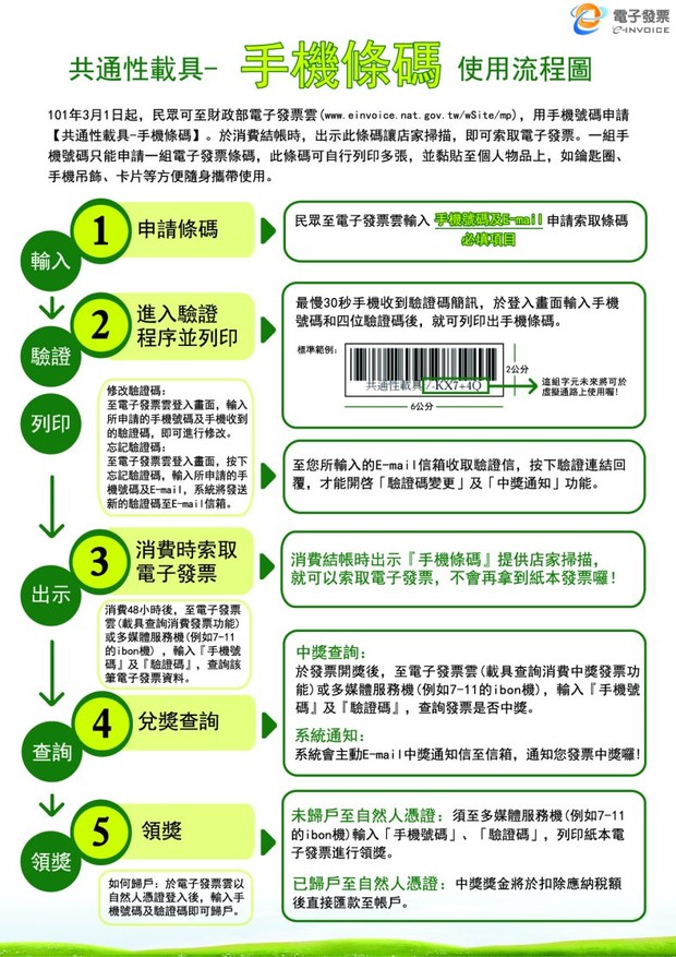 國稅局:申辦手機條碼贈好禮! --閱讀人次 : 861 為鼓勵民眾多使用載具索取電子發票,在5月綜合所得稅結算申報期間,特別為前來報稅的民眾,現場提供「申辦電子發票手機條碼專區」的專人服務,並贈送申辦完成民眾精美小禮物!(送完為止)