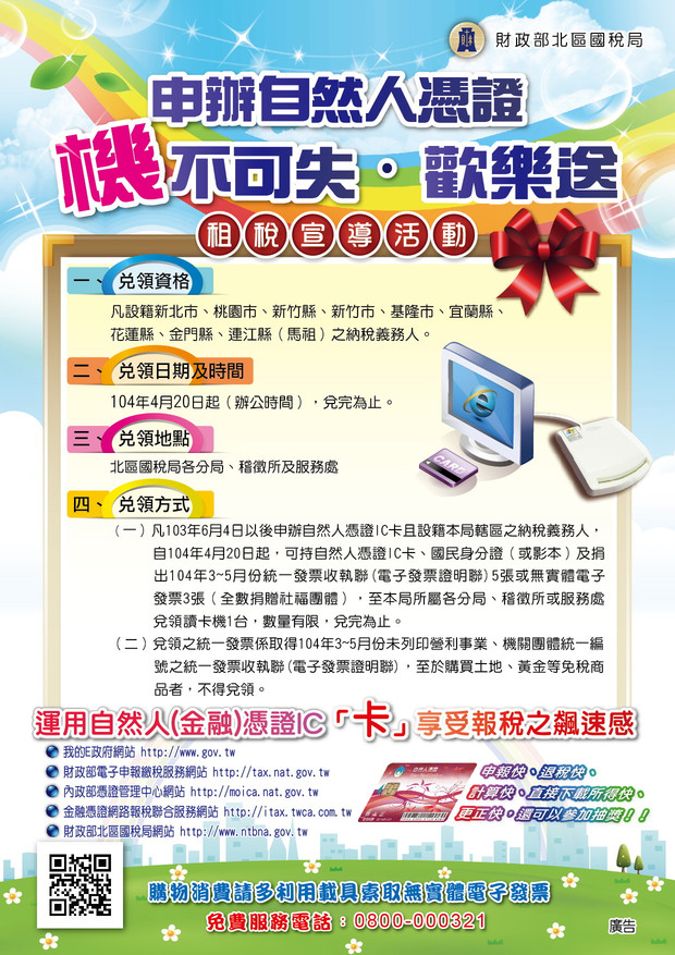 國稅局:申辦自然人憑證送讀卡機! --閱讀人次 : 1217 【申辦自然人憑證,「機」不可失,歡樂送】暨統一發票推行宣導活動