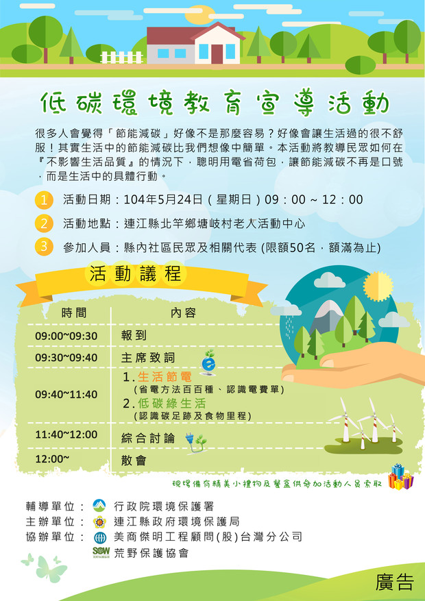 環保局5/23、5/24辦理低碳環境教育宣導 --閱讀人次 : 840 很多人會覺得「節能減碳」好像不是那麼容易?