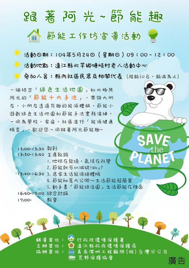環保局5/23、5/24辦理節能工作坊 --閱讀人次 : 843 本次活動將結合「綠色生活地圖」和北極熊阿光的「節能十大手法」