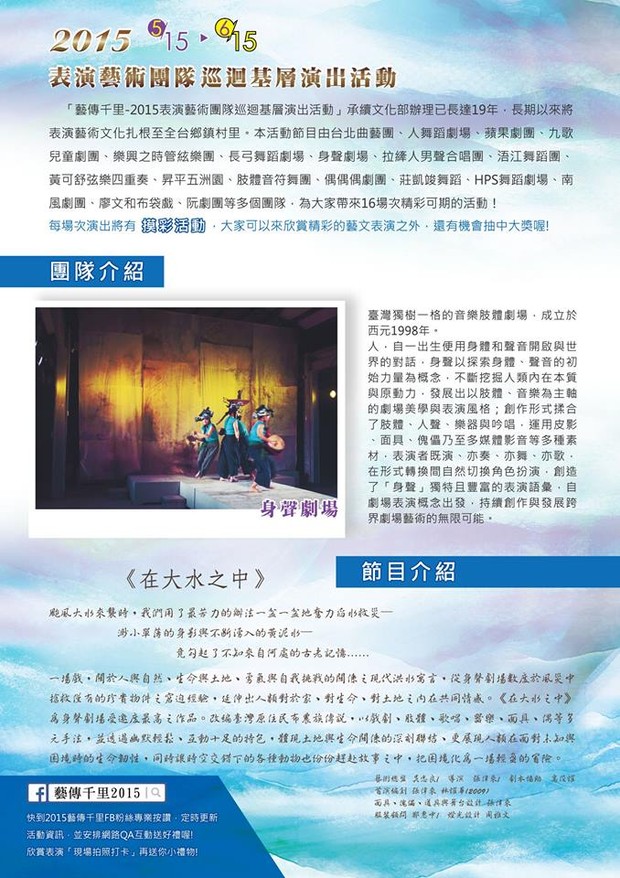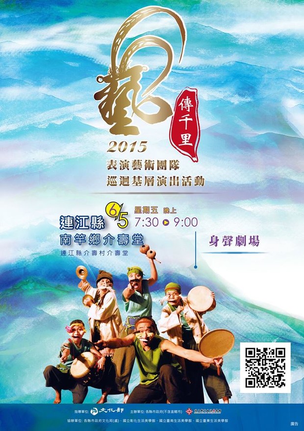 「藝傳千里」6/5南竿介壽堂演出 --閱讀人次 : 1286 「藝傳千里」巡迴演出第13站-6月5日禮拜五,即將到連江縣(馬祖)南竿鄉介壽堂,地址:連江縣介壽村介壽堂。本活動免費索票,座位保留至19:20,逾時不予保留,開放現場民眾補位。