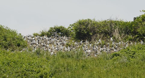 10日鳥會一行也前往莒光蛇山做調查,目前發現約有數百隻的白眉燕鷗,其它如蒼燕鷗和大鳳頭燕鷗數量則少很多,但大部的燕鷗都已經築巢落腳。若沒有颱風等外力干擾,現在馬祖各島的鳥況達到穩定狀態。