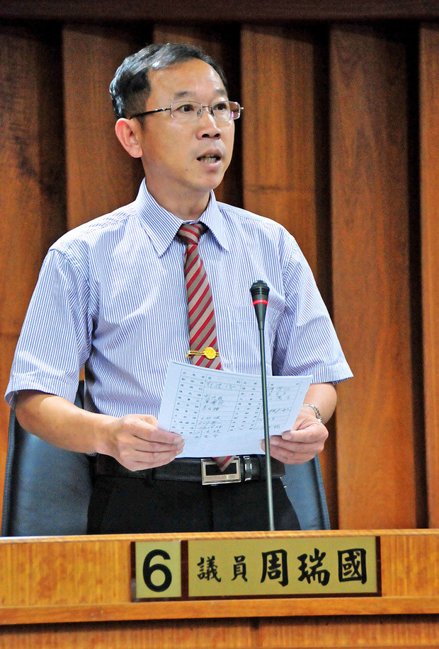 周瑞國也搭上土地問題列車,指出完成件數太少,要讓民眾有感;民政局長曹爾元指出,總登記之後的測量在今年4月26日完成,現正進行審查,分析糾紛地及先就村內、村外及糾紛人數等分類做統計,列出標準作業模式,加速還地於民;周瑞國認為廠商完成測量交付地政事務所之後,其結果就已明顯呈現哪些案件有糾紛,測量時就該很清楚,何必再花時間審查,建議地政專案人員充分利用,確立審核機制讓基層同仁有所依循,態度應主動積極,加快還地於民腳步。