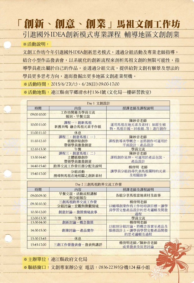 6/27-28「創新、創意、創業」馬祖文創工作坊