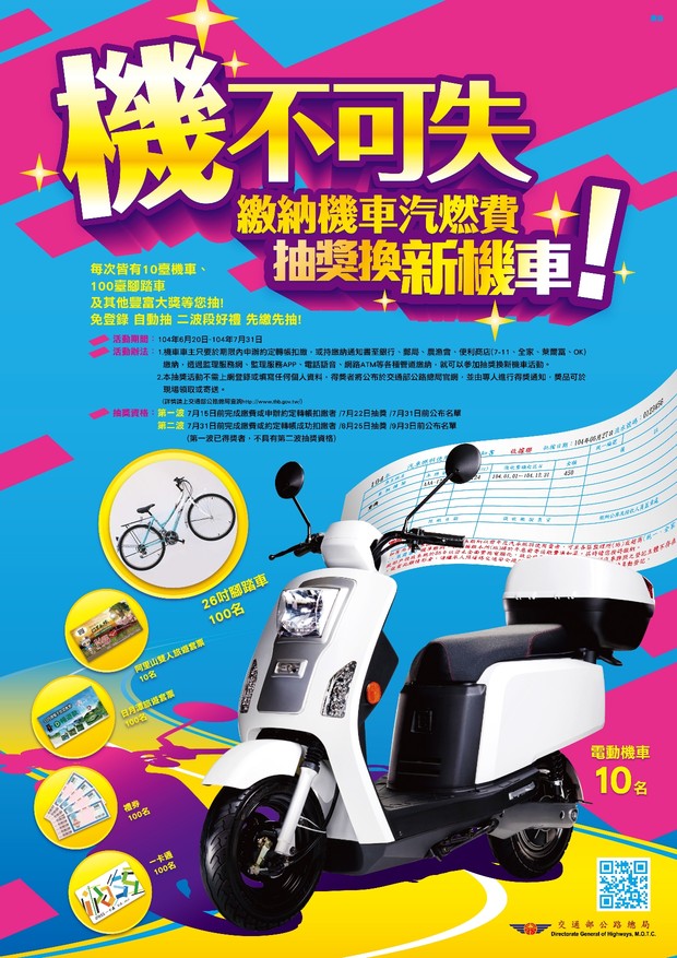 為鼓勵民眾能提前及按時繳納機車汽燃費,交通部公路總局特別舉辦抽獎活動,機車車主只要於期限內申辦約定轉帳扣繳,或持繳納通知書至銀行、郵局、農漁會、便利商店(7-11、全家、萊爾富、OK)繳納,透過監理服務網、監理服務APP、電話語音、網路ATM等各種管道繳納,就可以參加抽獎換新機車活動 。